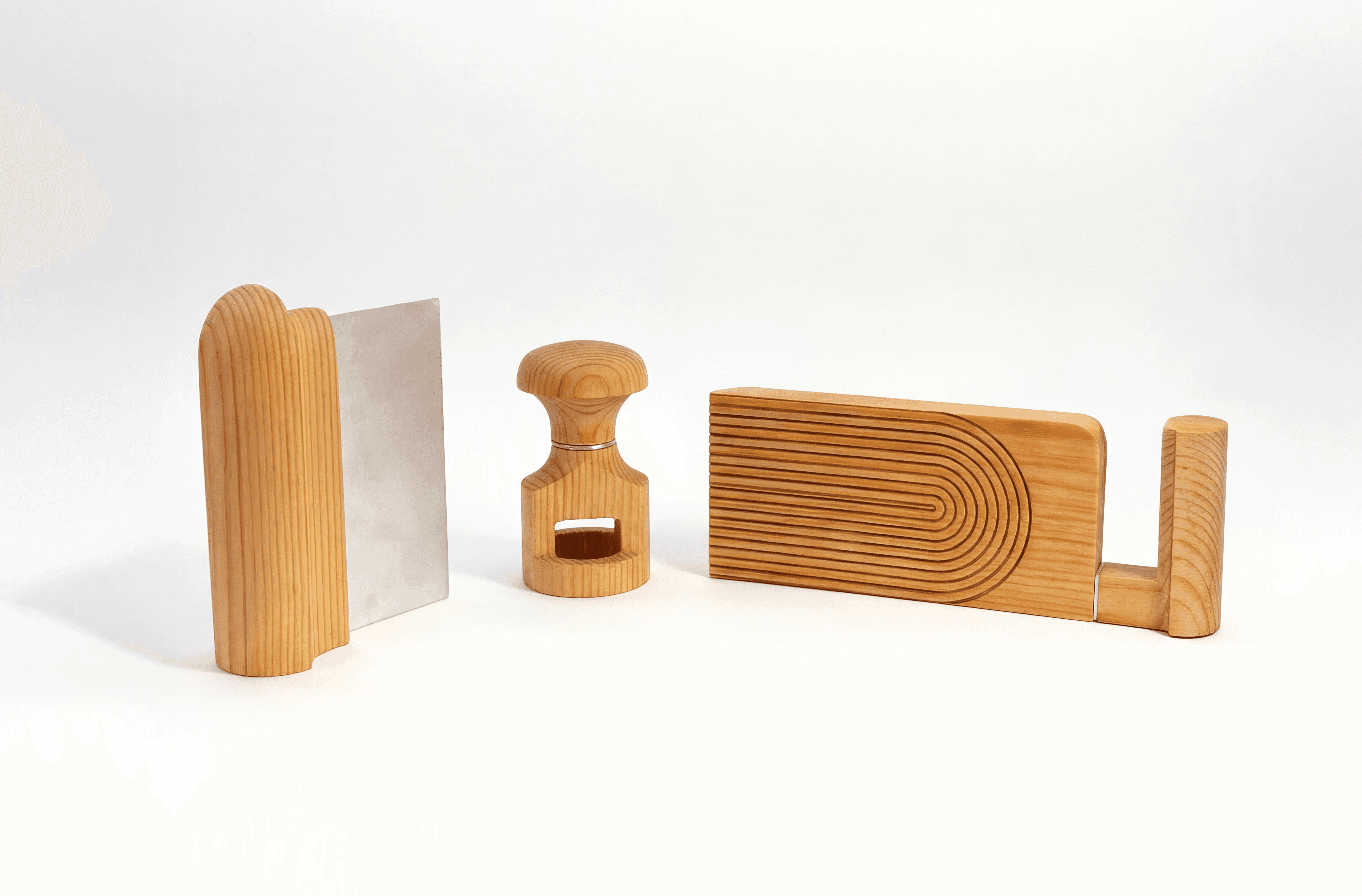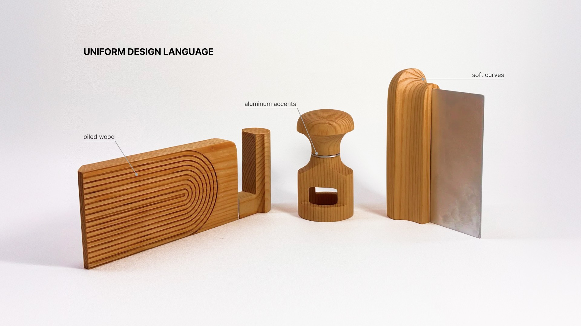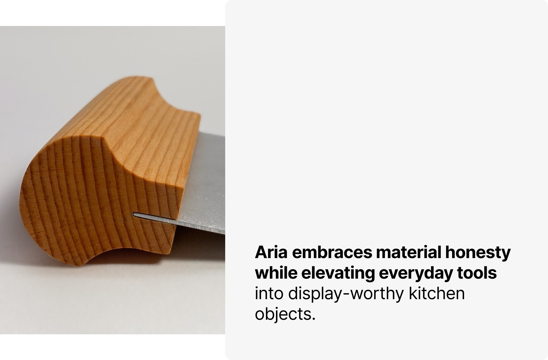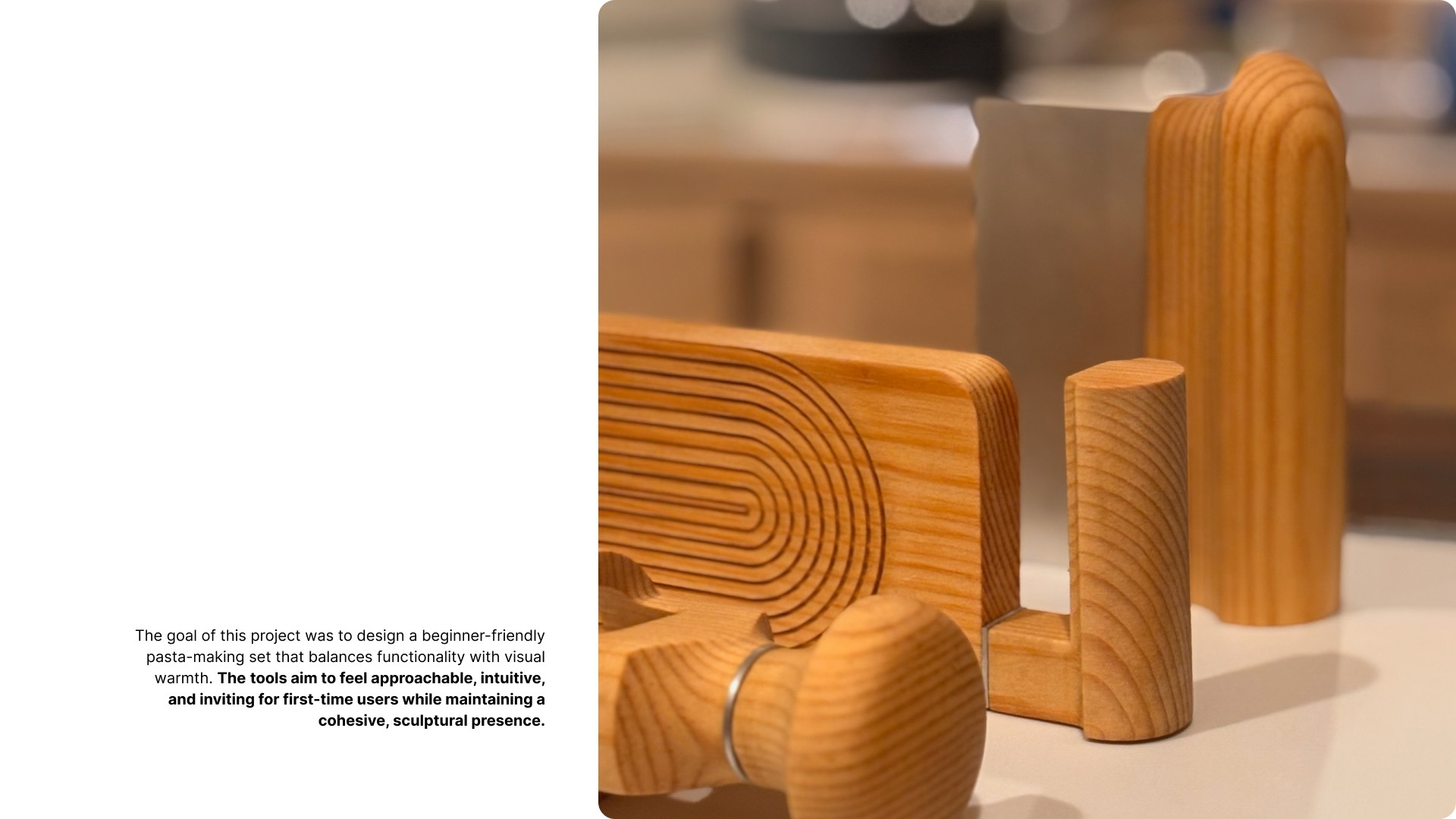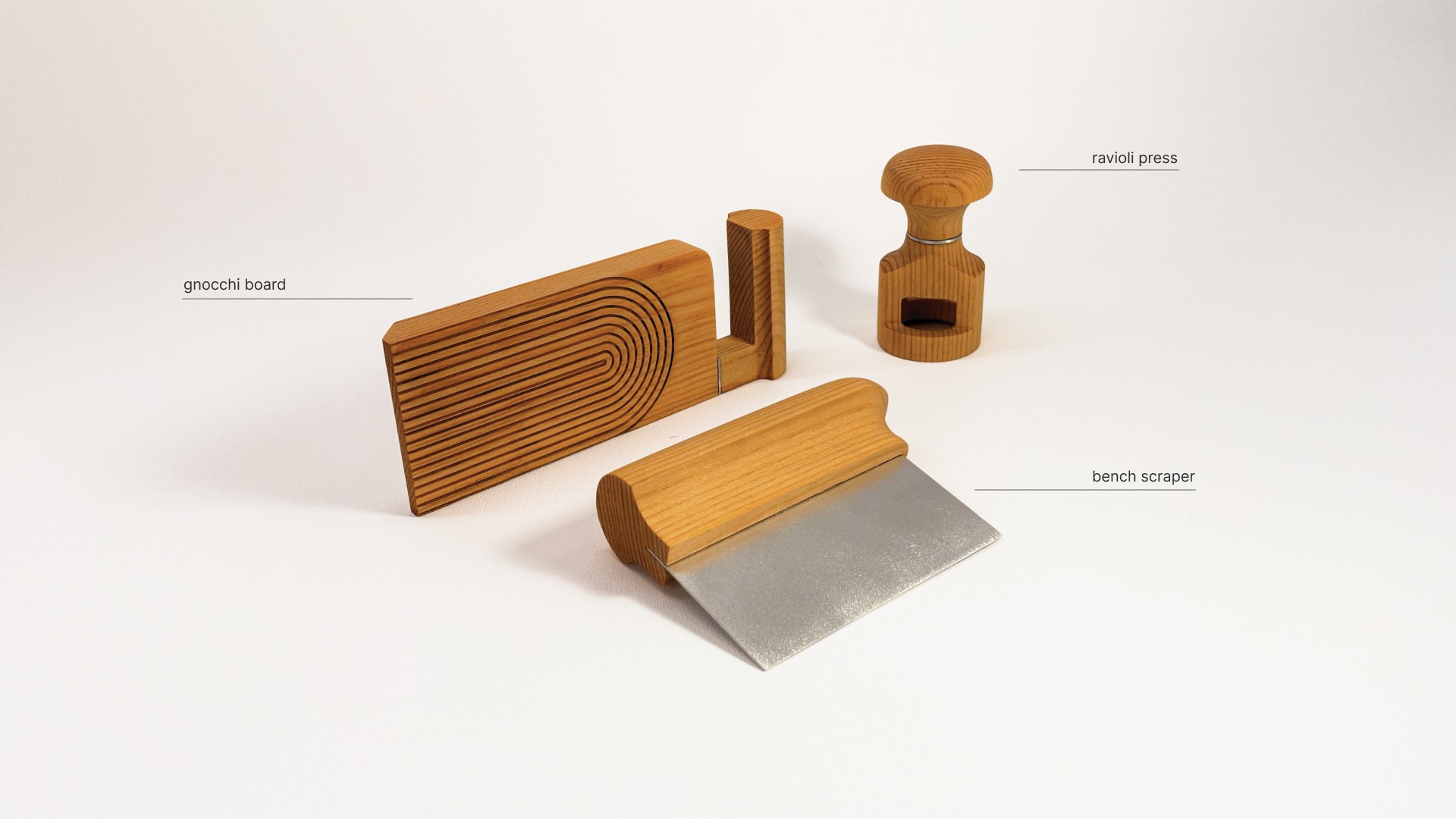 Aria is a three-piece pasta-making set designed to be both functional and display-worthy. The project emphasized material honesty, using wood for primary touchpoints with subtle metal accents to highlight structure and detail. Within the set, the bench scraper focuses on balance, edge precision, and tactile comfort.